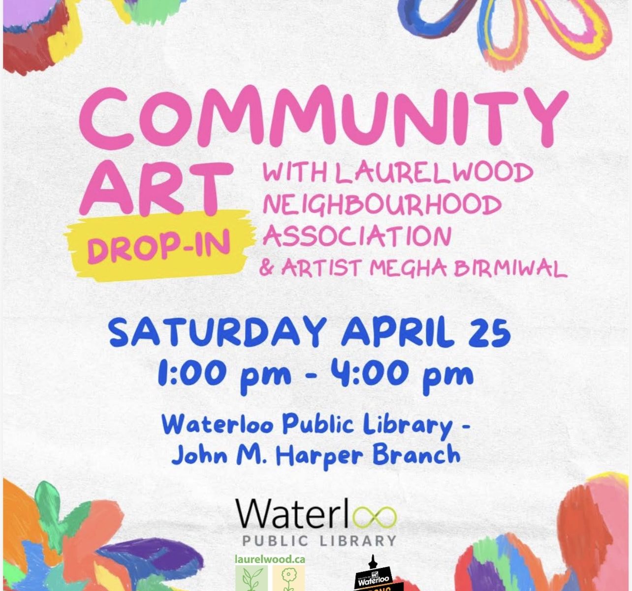 Join The Waterloo Public Library and The Laurelwood Neighbourhood Association to welcome spring in a creative and colourful way! Learn some art skills, interact with other neighbours of Laurelwood and unleash your creativity under the guidance of professional artist Megha Birmiwal. 🌷